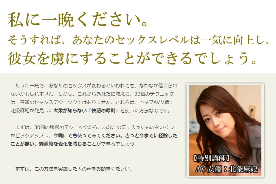 知らない方法ばかりで本当にビックリ!今まではエロ本に書いてあるテクニックを参考にしていましたが、本番で使ってみると役に立たないものばかりでした…。その点このテクニックは、すぐに使えるように解説されているので、この手のテクニックに興味がある方なら、誰にでも使いこなせると思います。