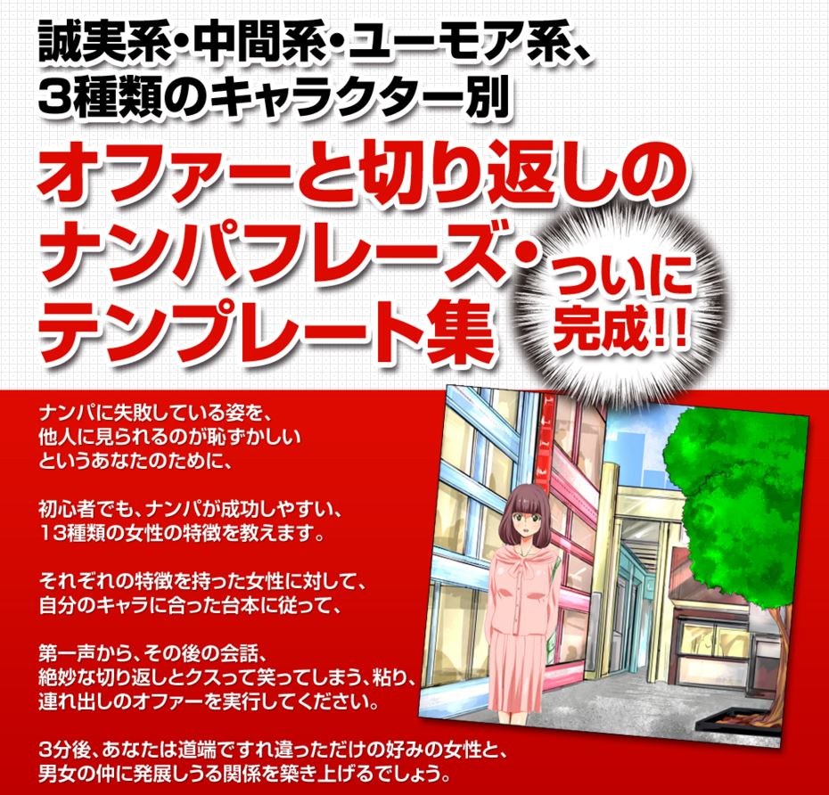 フレーズ一つ一つの理論まで解説しているので、このナンパテンプレートを基礎に、自己流のオリジナル版も確立できそうです。