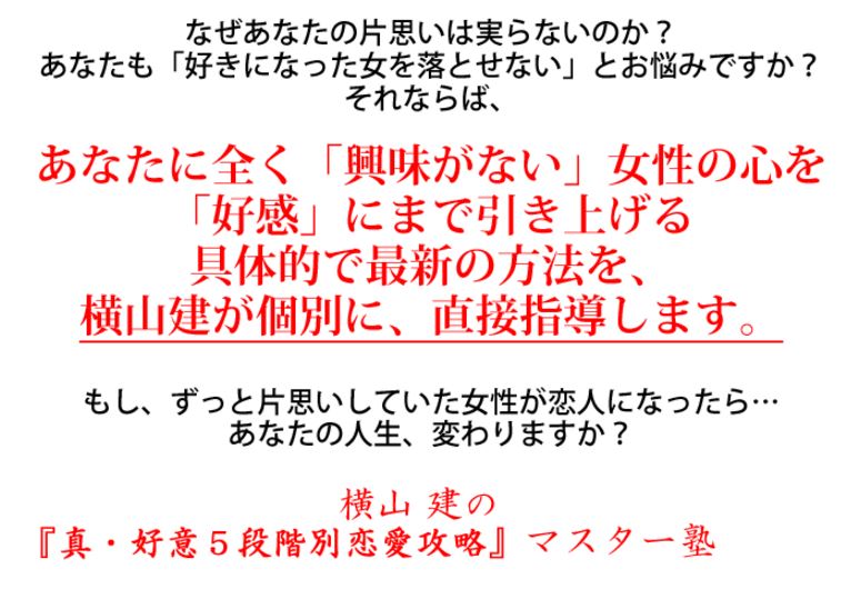⇒ 「横山建の『真・好意5段階別恋愛攻略』マスター塾」公式サイトへ